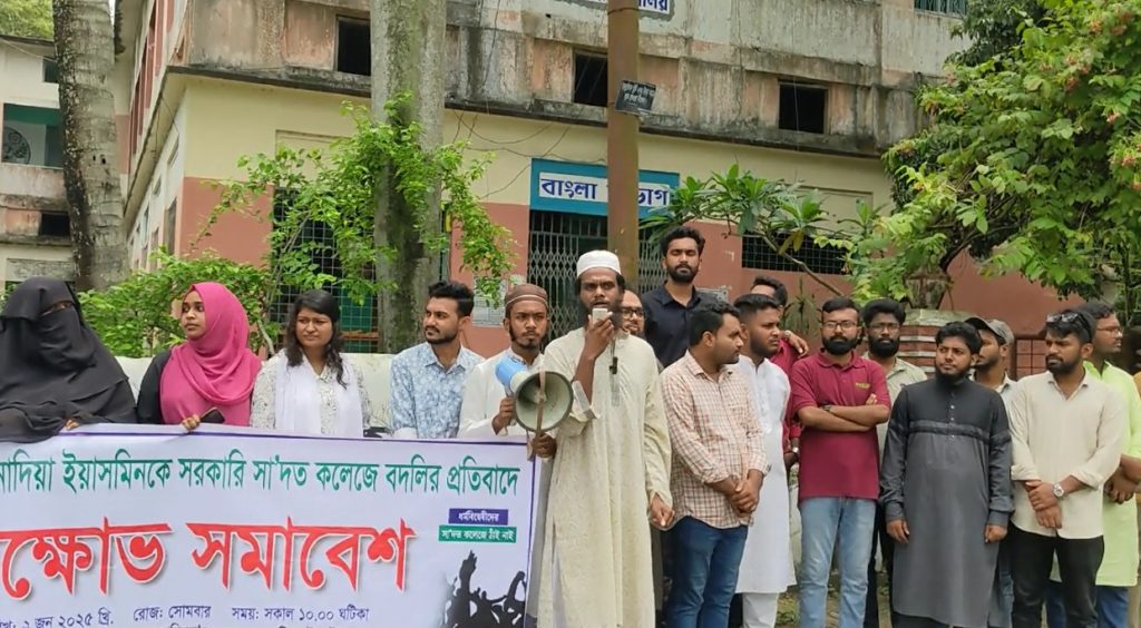 এ বিষয়টি জানাজানি হলে সন্ধ্যার পর থেকে সরকারি সা’দত সরকারি কলেজের শিক্ষক ও শিক্ষার্থীদের মধ্যে ক্ষোভের সৃষ্টি হয়। পরে ওইদিন রাত ৯টার দিকে কলেজের ওয়াজেদ আলী খান পন্নী হলের সামনে শিক্ষার্থীরা মানববন্ধন ও প্রতিবাদ কর্মসুচি পালন করে। কর্মসূচিতে শিক্ষার্থীরা সরকারি সা’দত কলেজে যোগদানের প্রজ্ঞাপন ৪ জুনের আগেই বাতিল করার দাবি করেন।