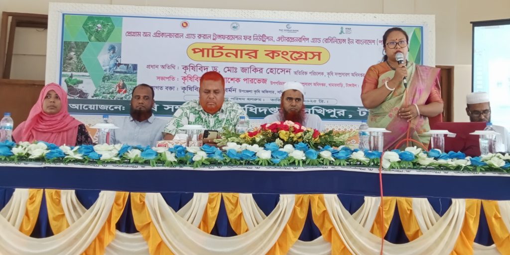 এম সাইফুল ইসলাম শাফলুঃ টাঙ্গাইলের সখীপুরে প্রোগ্রাম অন এগ্রিকালচারাল এন্ড রুরাল ট্রান্সফরমেশন ফর নিউট্রিশন, এন্টারপ্রেনরশিপ এন্ড রেসিলিয়েশন ইন বাংলাদেশ (পার্টনার) কংগ্রেস অনুষ্ঠিত হয়েছে। বৃহস্পতিবার দুপুর ১২ টায় উপজেলা পরিষদ মিলনায়তনে এ সভা অনুষ্ঠিত হয়। কৃষি সম্প্রসারণ অধিদপ্তর, খামারবাড়ি টাঙ্গাইল এর উপপরিচালক কৃষিবিদ মোঃ আশেক পারভেজ এর সভাপতিত্বে সভায় উপজেলা বিএনপির সভাপতি বীর মুক্তিযোদ্ধা শাহজাহান সাজু, কৃষি সম্প্রসারণ অধিদপ্তর, ঢাকা অঞ্চলের অতিরিক্ত পরিচালক কৃষিবিদ ড, মোঃ জাকির হোসেন, সখীপুর আবাসিক মহিলা কলেজের অধ্যক্ষ আবদুর রউফ মিয়া, সখীপুর উপজেলা কৃষি কর্মকর্তা কৃষিবিদ নিয়ন্তা বর্মন, বিআরডিবি চেয়ারম্যান ফরহাদ ইকবাল,প্রিন্ট ও ইলেকট্রনিকস মিডিয়ার সাংবাদিক এবং পৌরসভা ও উপজেলার ১০ টি ইউনিয়নের পার্টনার কংগ্রেস আওতাধীন কৃষকেরা উপস্থিত ছিলেন। rivnepost