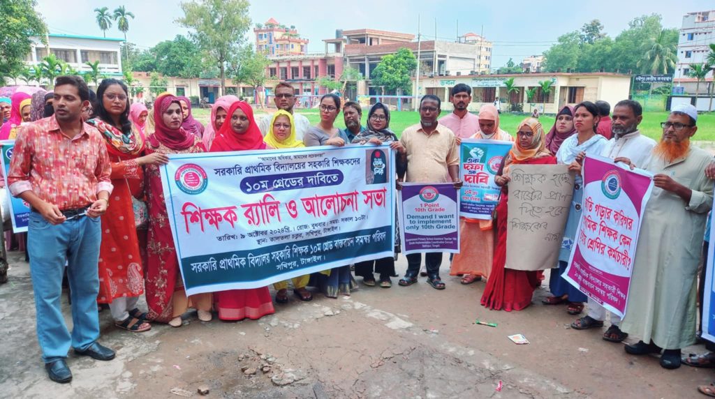 এম সাইফুল ইসলাম শাফলুঃ টাঙ্গাইলের সখীপুরে সরকারি প্রাথমিক বিদ্যালয়ের সহকারি শিক্ষকদের ১০ম গ্রেড বাস্তবায়নের দাবিতে র্যালি ও আলোচনা সভা অনুষ্ঠিত হয়েছে।বুধবার(০৯ অক্টোবর) সকাল ১০ টায় সখীপুর তালতলা চত্বরে এ র্যালি ও আলোচনা সভা অনুষ্ঠিত হয়।