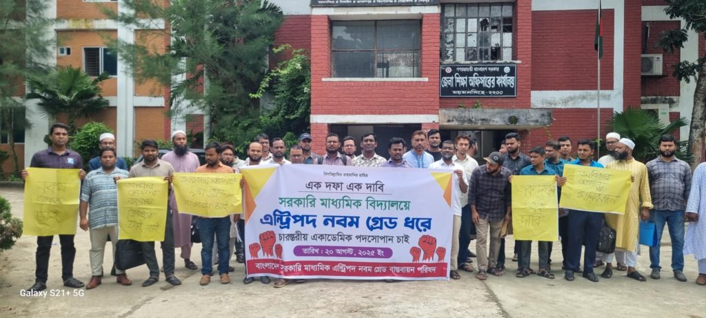 মঙ্গলবার (১৯ আগষ্ট) সকালে ময়মনসিংহ নগরীর জেলা শিক্ষা অফিসার কার্যালয়ের মূল ফটকের সামনে শতাধিক শিক্ষকরা একত্রিত হয়ে ঘন্টাব্যাপী এ মানববন্ধন কর্মসূচি পালন করেন। মানববন্ধনে বক্তারা বলেন- আমরা শিক্ষকরা দীর্ঘদিন ধরে এন্ট্রিপদ নবম গ্রেডে উন্নীত করার দাবি জানিয়ে আসছি, যা জাতীয় শিক্ষানীতিতেও উল্লেখ রয়েছে। আমদের দাবি সরকারি মাধ্যমিক বিদ্যালয়ের শিক্ষকদের (সহকারী শিক্ষক) এন্ট্রিপদ নবম গ্রেডে উন্নীত করতে হবে এবং চার স্তরীয় পদসোপান (সরকারি কলেজের মতো) বাস্তবায়ন করতে হবে। মাধ্যমিক শিক্ষার জন্য স্বতন্ত্র শিক্ষা অধিদপ্তর প্রতিষ্ঠা করতে হবে। ১৯৭৩ সালে সহকারি শিক্ষক পদের সাথে পিটিআই ইন্সট্রাক্টর, সমাজসেবা কর্মকর্তা, থানা প্রাথমিক কর্মকর্তা, সাবরেজিস্টার ও পুলিশ পরিদর্শক ছিলো ৬ষ্ঠ গ্রেড। কিন্তু ১৯৭৭ সালে সরকারী শিক্ষক পদ ও পিটিআই ইন্সট্রাক্টর পদ ১০ম গ্রেড করা হয়। অপরদিকে সমাজসেবা কর্মকর্তা, থানা প্রাথমিক কর্মকর্তা এবং সাবরেজিস্টার পদ ১১তম গ্রেড করা হয়। ১৯৮৫ সালে সমাজসেবা কর্মকর্তাদেরকে ৯ম গ্রেডে উন্নীত করা হয়। একই ধারাবাহিকতায় ১৯৯১ সালে সাবরেজিস্টারকে একই গ্রেডে উন্নীত করা হয়। ১৯৯৭ সালে থানা প্রাথমিক কর্মকর্তা এবং পিটিআই ইন্সট্রাক্টরকে ৯ম গ্রেডে উন্নীত করা হয়। কিন্তু সরকারি মাধ্যমিক বিদ্যালয়ের শিক্ষকদের (সহকারী শিক্ষক) যেটা শুরুতে ছিলো ১০ গ্রেড, সেটা আজ ২০২৫ সাল পেরিয়ে যাচ্ছে কিন্তু অদ্যাবদি পর্যন্ত তা বহাল রয়ে গেছে। আমরা এজন্য চরমভাবে বৈষম্যের শিকার, বঞ্চনার শিকার হচ্ছি, অর্থনৈতিকভাবে, প্রশাসনিক ভাবে
