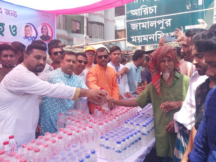 নিজস্ব প্রতিবেদক: তীব্র দাবদাহ বয়ে যাচ্ছে। এই গরমে মানুষের জনজীবন অতিষ্ঠ হয়ে উঠেছে। এরমধ্যে চরম বিপাকে পড়েছেন খেটে-খাওয়া নিম্ন আয়ের মানুষ। এসব মানুষদের কিছুটা স্বস্তি দিতে সুপেয় পানির বোতল, শরবত, বিস্কুট ও ছাতা বিতরণ করেছেন টাঙ্গাইল জেলা যুবলীগ।