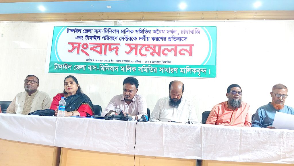 বৃহস্পতিবার (১০ অক্টোবর) দুপুরে টাঙ্গাইল প্রেসক্লাবের বঙ্গবন্ধু ভিআইপি অডিটরিয়ামে টাঙ্গাইল জেলা বাস-মিনিবাস মালিক সমিতির সাধারণ সদস্যরা সংবাদ সম্মেলনে এমন অভিযোগ করে জেলা পরিবহন সাধারণ শ্রমিক ও মালিকরা।